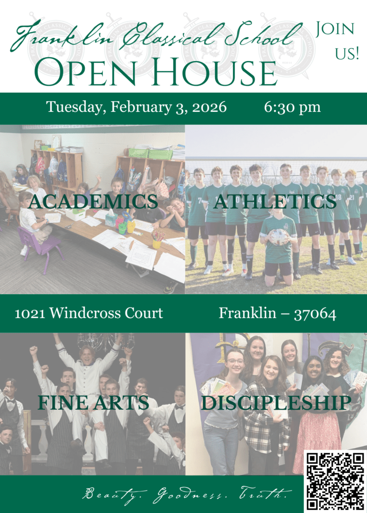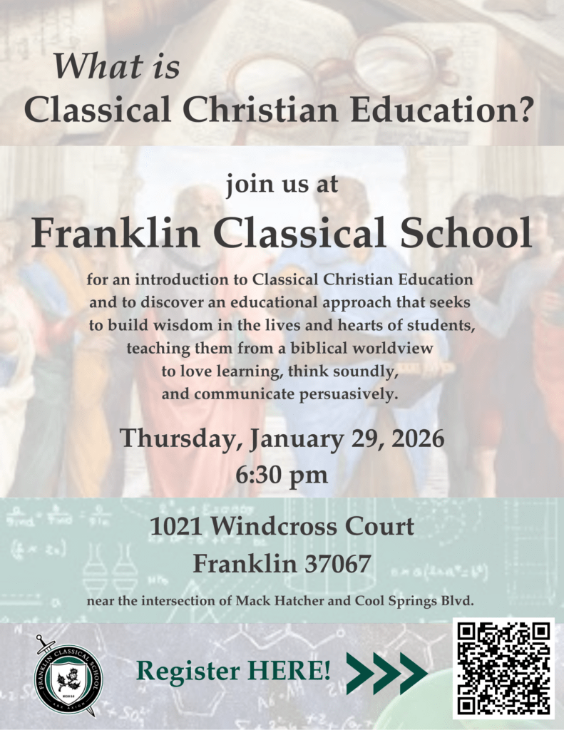 Thank you for your interest in Franklin Classical School! Our purpose at FCS is to raise up the next generation of Christian cultural and spiritual leaders through our covenant community and academic disciplines.