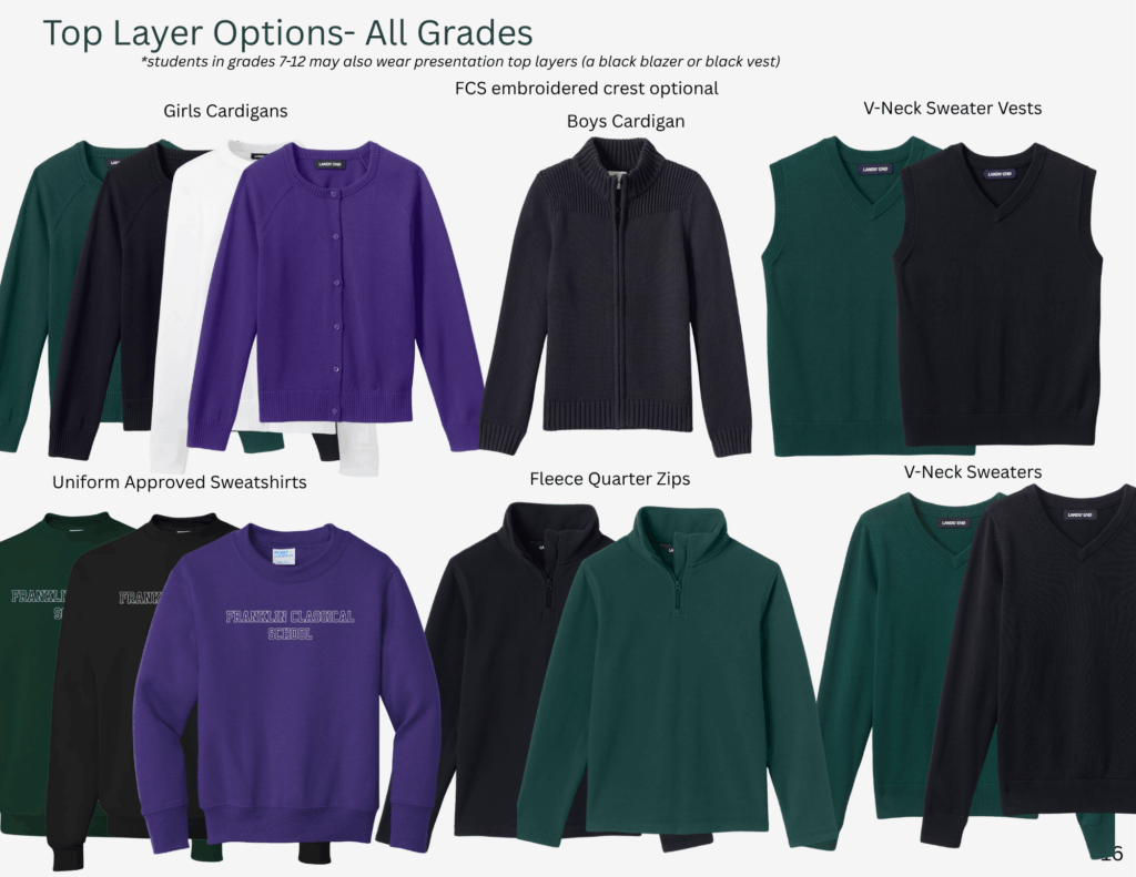 These items are a great way to represent Franklin Classical School and can be worn anytime outside of school hours. They are perfect for camp days, spirit days, athletic events, or simply to show your support for the school in the community!